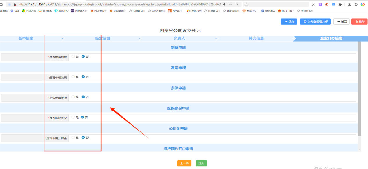 五、名称登记否选“是”其余按自身需求勾选,然后点击进入办理。